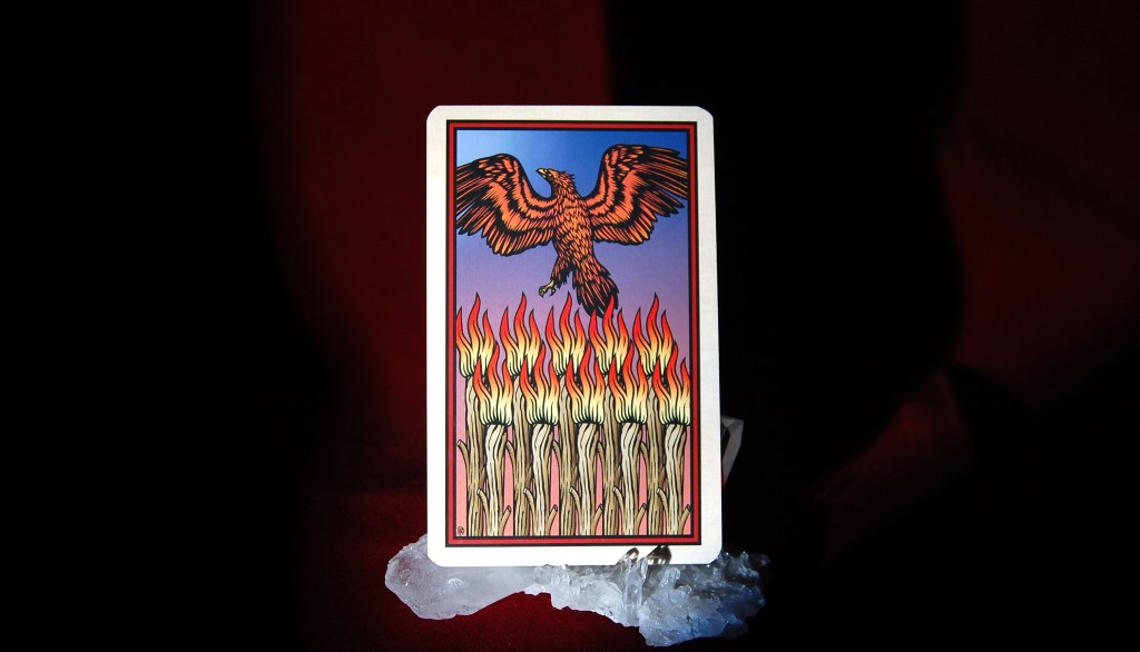 타로에서 완즈, 그러니까 불 속성 마이너 카드의 10번을 해석하기 위해 갖게 되는 관점은 크게 두 가지가 있습니다. 하나는 보통 ‘라이더-웨이트-스미스’ 덱의 카드 그림에서 보여지는 힘겨워하는 모습입니다. 황금새벽회 의미로는 ‘억눌림’이고, 감당할 수 없을 정도로 너무 많은 일을 떠안은 상태라는 일반적 풀이로 이어집니다. 그리고 다른 하나는 그동안 목적을 달성하기 위해 쏟아부었던 의지나 열정들이 하나로 모여 마무리되고 전혀 새로우면서도 다음 단계의 일로 이어진다는 의미입니다. 이번 주 첨부 사진의 카드는 두 번째 의미와 연결됩니다. 카드의 저자인 로버트 플레이스는 연금술에서 불사조가 ‘현자의 돌’을 상징한다고 설명합니다. 지금까지 어렵사리 해 온 일들의 결과물이면서 그 결과물을 활용하기 위한 다음 단계로 접어든다는 의미입니다.