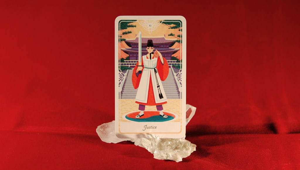 이번 주의 카드 <져스티스>는 기본적으로 균형, 그것도 카르마라는 개념에서 유래하는 균형을 뜻합니다. 그런 균형은 인간이 가지는 선악 개념과는 무관합니다. 단순한 힘의 균형이라고 말하기도 어렵습니다. 아마 ‘인과의 균형’이라고 말하면 좀 더 비슷해지지 않을까 합니다. ‘라이더-웨이트-스미스’ 타로 덱의 구성 작가인 아서 웨이트는 이 카드와 관련해 ‘도덕적 원리는 영적 정의와 근본적으로 다르다’고 말했습니다.