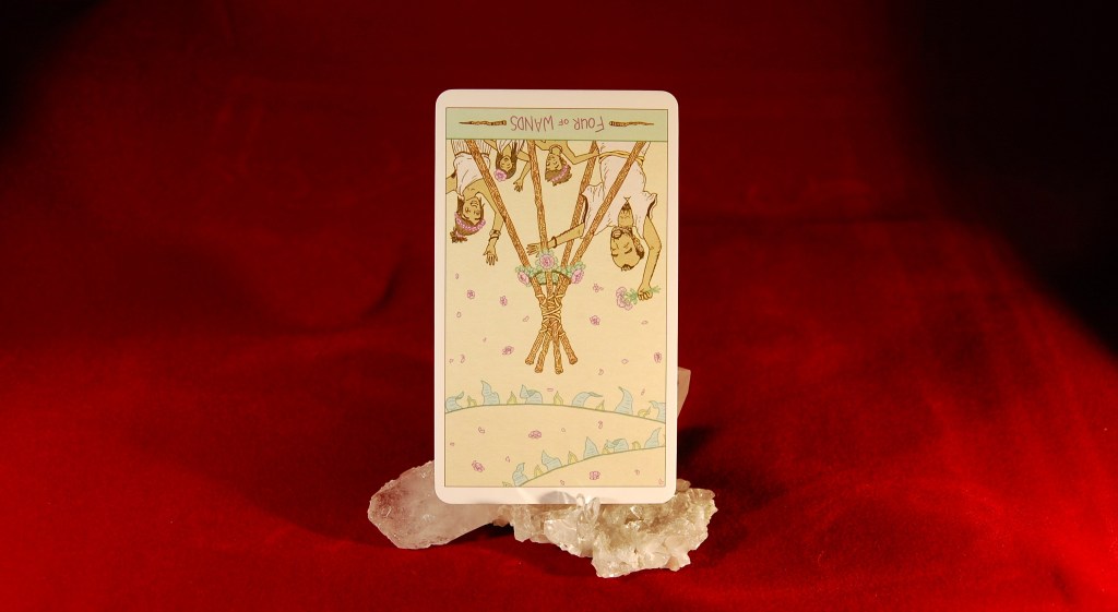 선한 의도에서, 자신이나 주위에서 생겨나는 흐름을 거스르지 않고 시작해 잘 진행될 것만 같아 보이던 일이 돌아볼 때마다 늘어지고 자꾸 가로막히는 느낌이 든다면 당연히 좌절감이 생깁니다. 게다가 지금까지의 망설임이나 주저함을 벗어버리려는 용기를 이제 막 발휘한 상태에서 그렇게 늘어지고 가로막힌다면 좌절감에 실망이나 짜증 같은 다른 감정들이 달라붙을 수 있습니다. 이번 주의 카드 <완드 4> 역방향은 이런 모습을 보여줍니다.